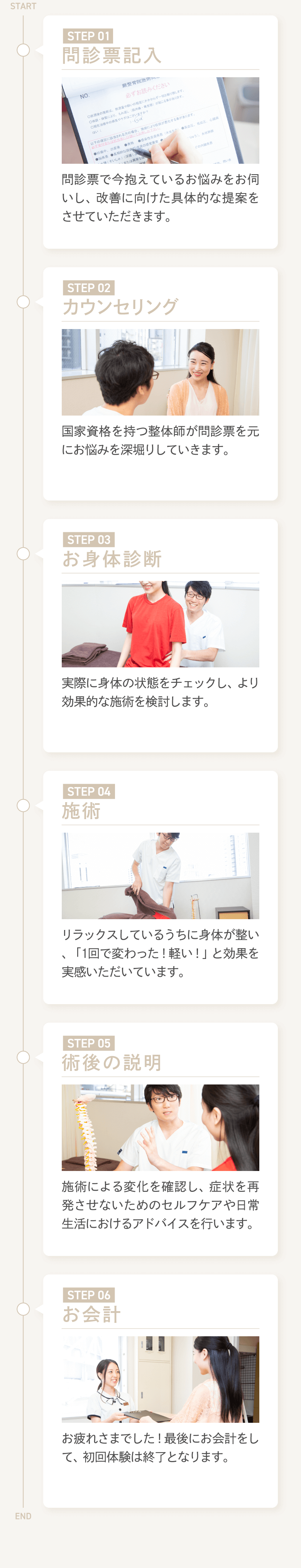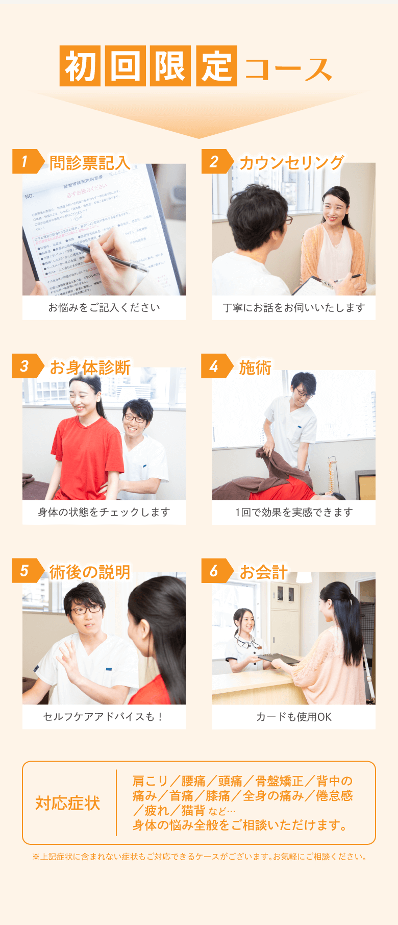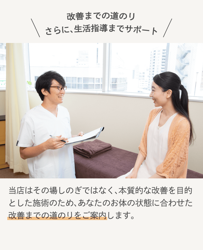 初診時に、カウンセリングをさせていただき、具体的な施術プランをお伝えさせていただきます。