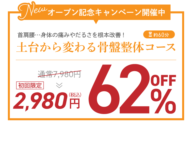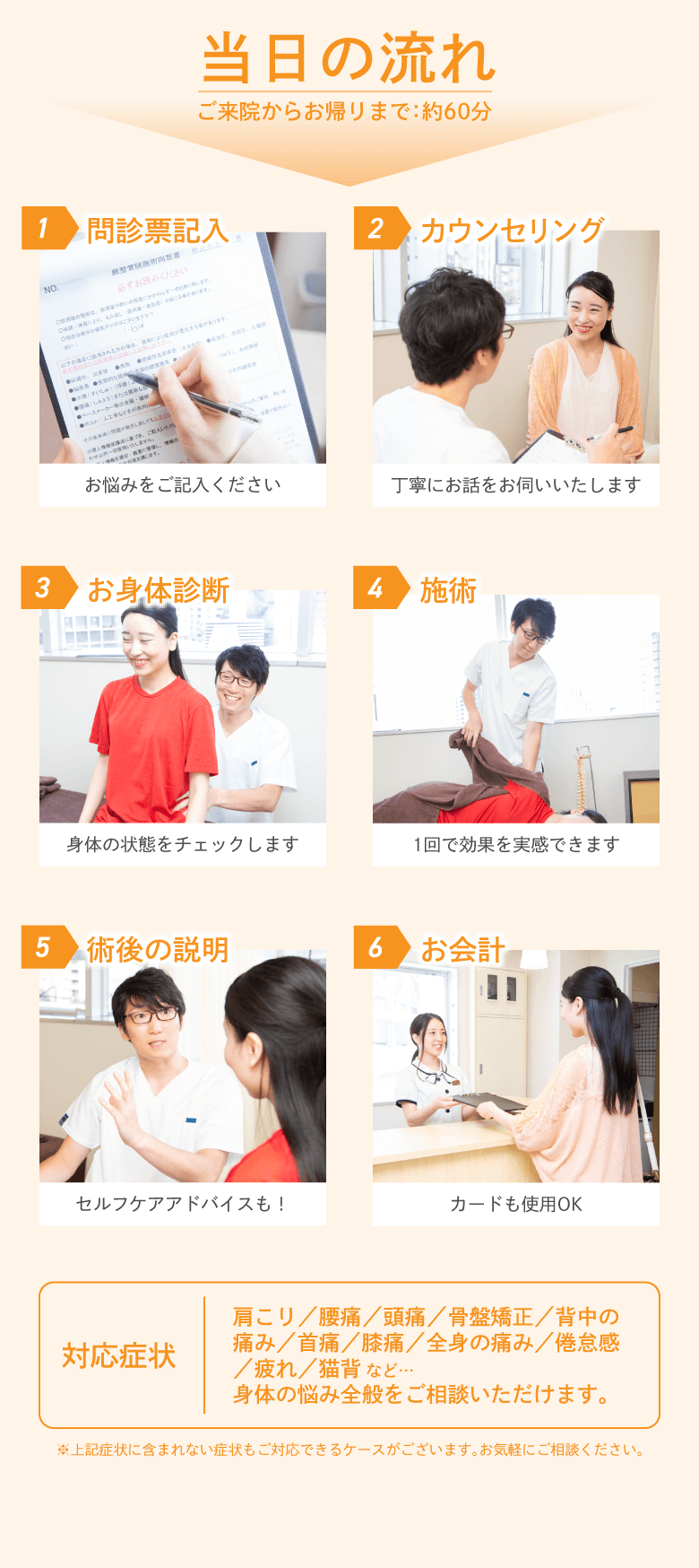 当院ではあなたのお身体の状態、原因、今後どのように身体を根本から改善していくかなど…あなたの身体を良くしていくためにカウンセリング、説明、セルフケアの指導に力を入れています。そのため、実際に身体を触る時間は60分よりも少なくなります。予めご了承ください。