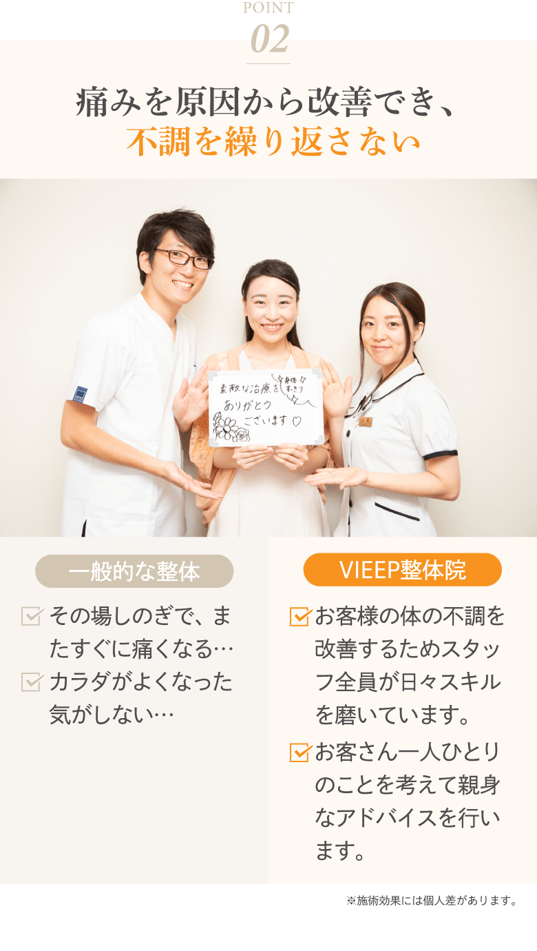 VIEEP整体院の施術は、むやみに強く揉んだり押したりいたしません。お客様のお身体に負担にならないソフトな施術となりますので、小さいお子様からご年配の方までご安心して施術をお受けできます。