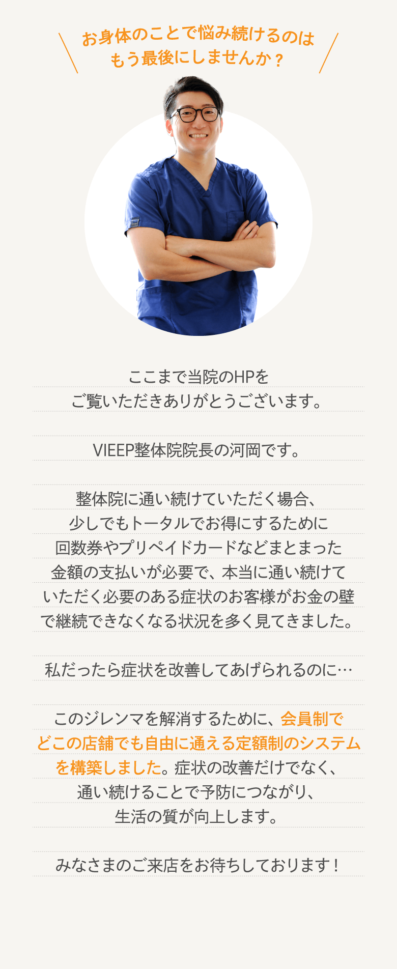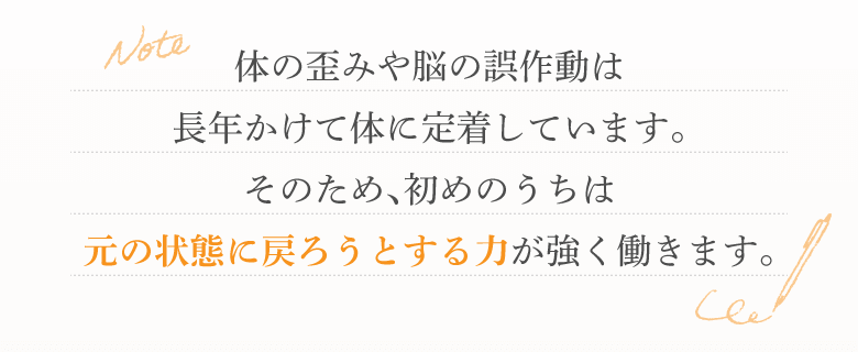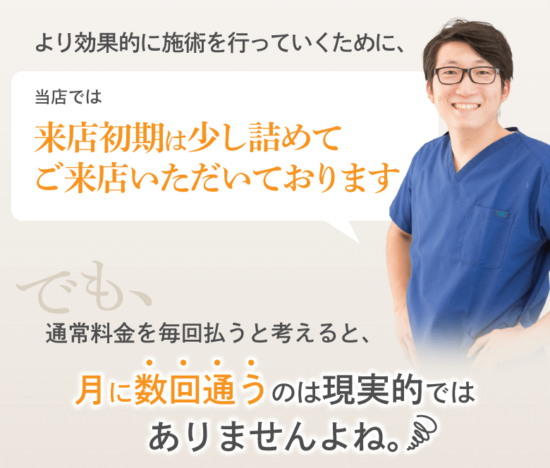 その後は、お身体の状態を確認しながら1週間後・2週間後と間隔を空けていき、最終的に1ヶ月~2ヶ月に1度のペースでご来店を頂くケースが多いです。